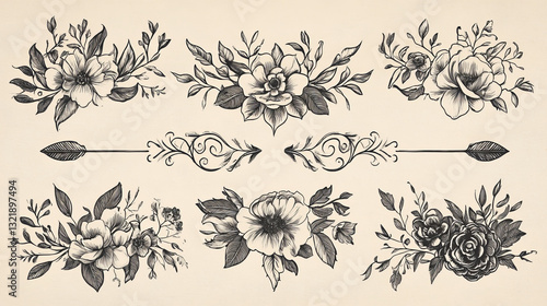Flower ornament dividers. Hand drawn vines decoration, floral ornamental divider and sketch leaves ornaments. Ink flourish and arrow decorations dividers victorian doodles isolated vector icons set