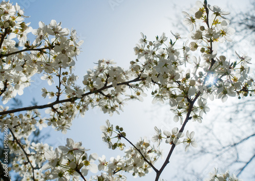 Flowering cherry against a blue sky. Cherry blossoms. Spring background