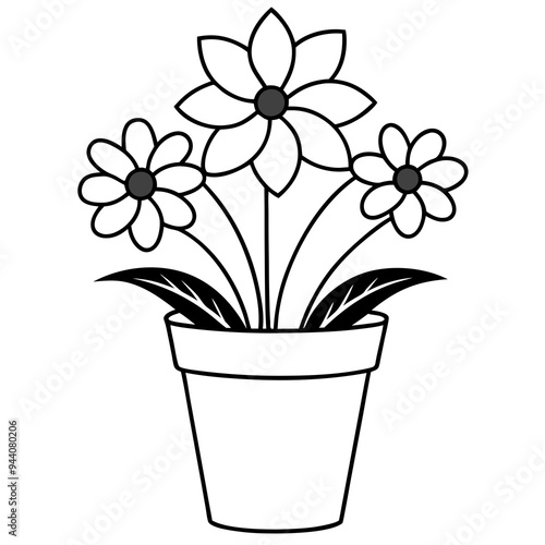 Flowering Potted Plant line art Vector on White Background