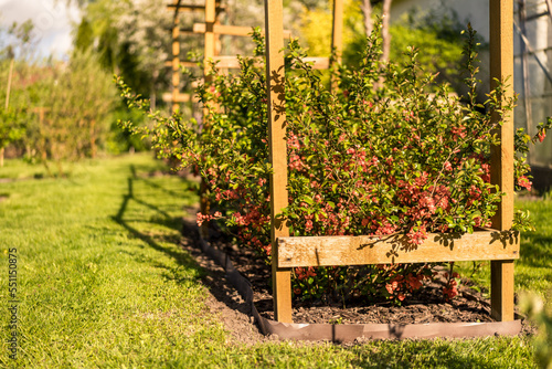 flowering quince bushes surrounded by a wooden pergola. quince blooming in spring. pink quince flowers on a sunny spring day. well-maintained garden. blurred background.