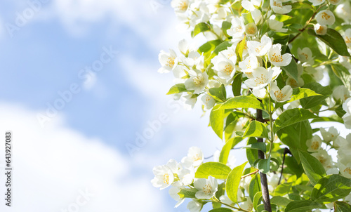 Flowering shrub mock orange, white flowers close-up against the sky.
