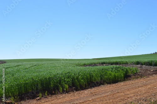 Flowering wheat crop under a blue sky