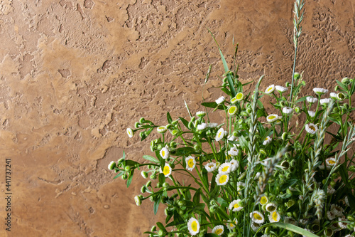 Flowers - field daisies on a brown stone. Horizontal orientation. Close up.