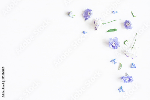 Flowers composition. Border made of lilac and white flowers. Flat lay, top view