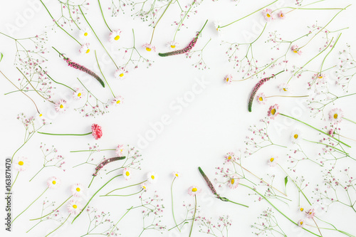 Flowers composition. Floral frame made of pink gypsophila flowers and daisy flowers on white background. Flat lay, top view, copy space