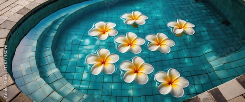 Flowers floating in a turquoise pool with decorative tiles and ample Copy Space for text placement