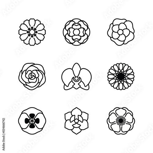 Flowers icon set. Blossoms top view - zinnia, jasmine, camellia, rose, orchid, gerbera, poppy, magnolia, anemone. Stylized illustration in minimalist style. Editable thin strokes, flowering sign