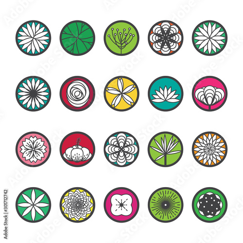 Flowers icons in a round shape. Single line style. Editable.