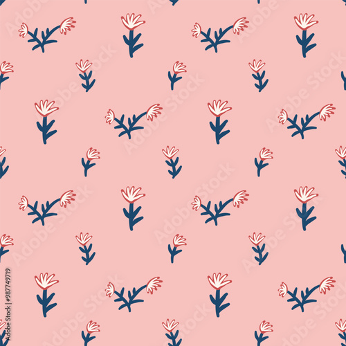 Flowers pink seamless pattern. Simple floral endless background. Stylized wildflower repeat cover. Vector hand drawn flat illustration.