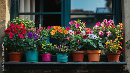 Flowers, plants and cactus hanging in flower pots on a balcony in front of a window.