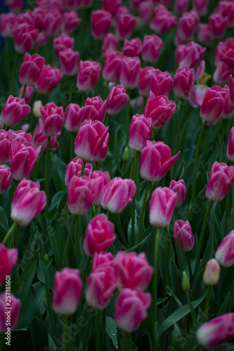 Flowers red tulips flowering on background of flowers yellow tulips in tulips field