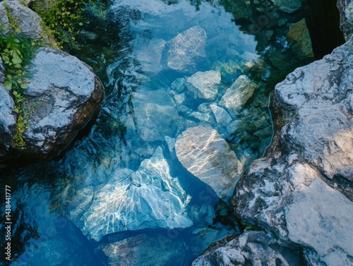 Flowing Clarity of an Ancient Stream Adorned With Shimmering Reflections and Smooth Stones Under Gently Filtering Sunlight