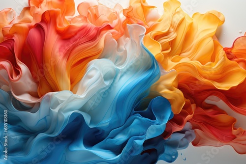 Flowing fabric of vibrant blue, red, orange, and white hues, creating an abstract and dynamic visual wave