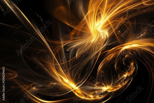 Flowing golden light waves on dark background. Neural network AI generated