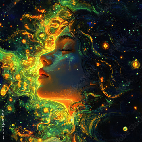 flowing hair that transforms into patterns and glowing, star-like shapes, tie-dye