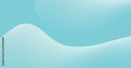Flowing halftone dotted wave on sky blue background – abstract vector design.
