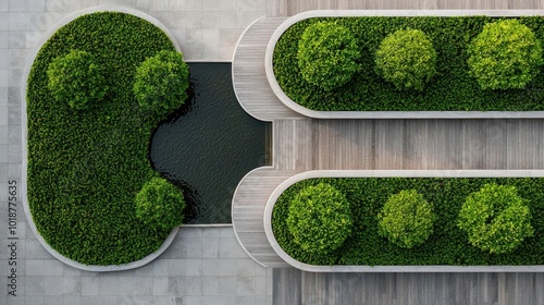 Flowing, nature-inspired public park design with organic shapes and water features, urban park, organic landscaping