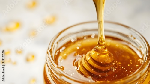 Flowing Stream of Golden Honey Cascading from Glass Jar