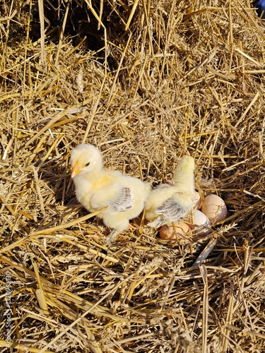 Fluffy Baby Chicks Exploring a Sunlit Straw Nest.