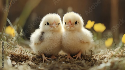 Fluffy black and white chickens standing together, cute and serene, soft afternoon light, shallow depth of field