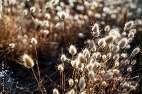 Fluffy bunny tail grass glowing in warm sunlight, creating a soft and dreamy natural background
