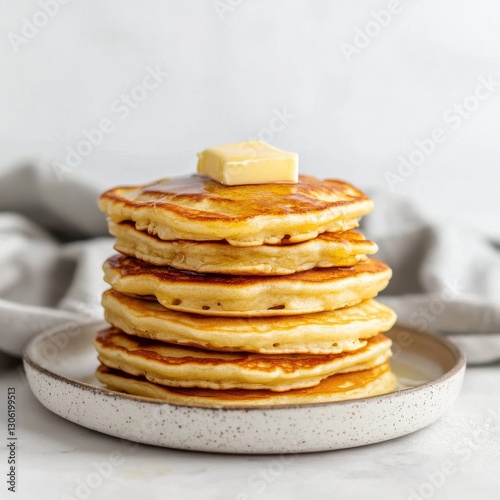 Fluffy buttermilk pancakes stacked high on a light plate with a pat of butter on top, creating a delicious breakfast delight