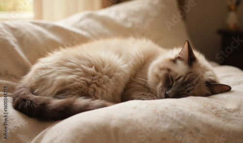 Fluffy cat sleeps peacefully on cozy blanket. Warm indoor lighting highlights its fur. Domestic pet exhibits comfort and contentment, embodying tranquility in its natural habitat. Sweet slumber scene.