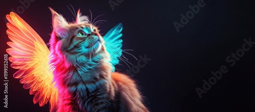 Fluffy cat with vibrant neon pink and blue wings against a dark background with ample empty space for text and branding.