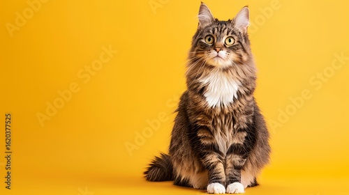 Fluffy cat with white markings, sitting against a yellow studio backdrop, centered composition