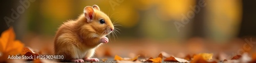 Fluffy golden hamster gazes left, autumn leaves nearby, pet, celebration, yellow