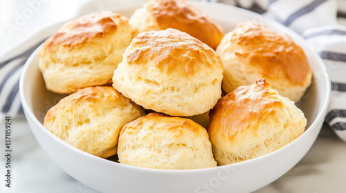 Fluffy golden homemade buttermilk buns in a white bowl on kitchen table