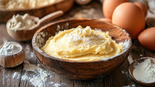 Fluffy pancake batter preparation in a wooden bowl with fresh eggs and flour on a rustic kitchen table