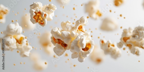 Fluffy popcorn kernels flying through the air in a playful display during a cinematic experience