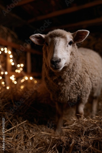 Fluffy sheep surrounded by festive lights in cozy barn setting