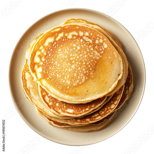 Fluffy stack of golden pancakes served on a beige ceramic plate, isolated on white transparent background, concept of breakfast or brunch meal