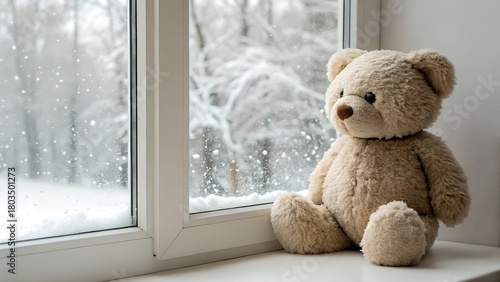 Fluffy Teddy Bear Sits By A Snowy Window Looking Outside At Winter Trees And Falling Snow