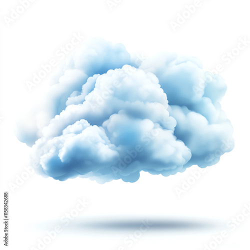 Fluffy white cloud with shades of blue, isolated on a white background.