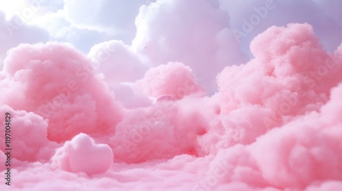 Fluffy white clouds against a dreamy pink background, creating a surreal and peaceful scene