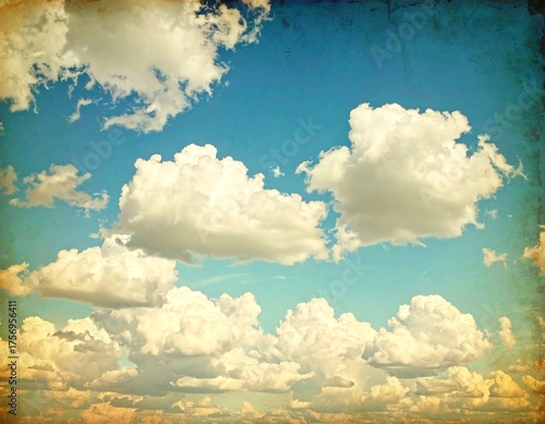Fluffy white clouds float against a vintage-toned bright blue sky