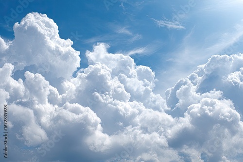 Fluffy white cumulus clouds against a vibrant blue sky. Sunlight highlights the clouds' texture