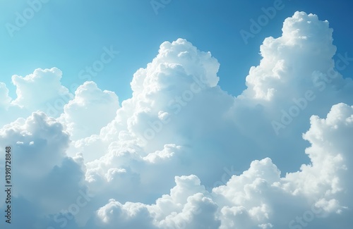 Fluffy white cumulus clouds float blue sky. Peaceful day, bright sunlight. Serene, airy, nature beauty. Perfect for backgrounds, weather themes, travel, holidays, dreams, freedom concept.