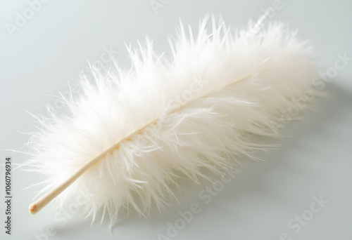 Fluffy white feather resting on a soft gray surface, highlighting its elegant texture, with copy space