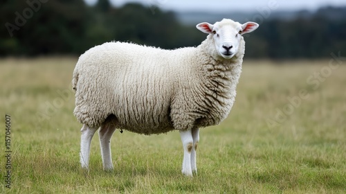 Fluffy white sheep standing in a lush green field with natural scenery in the background during a calm day.