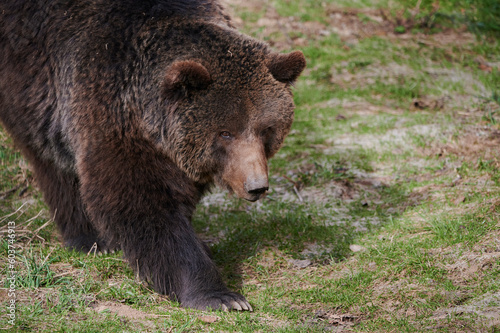 Fluffy wild brown bear walking on ground in nature