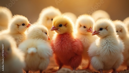 Fluffy yellow and red chick stands in group of white chicks. Small newborn bird looks around in soft light. Easter concept. Individuality and difference theme. Poultry farm domestic animal.