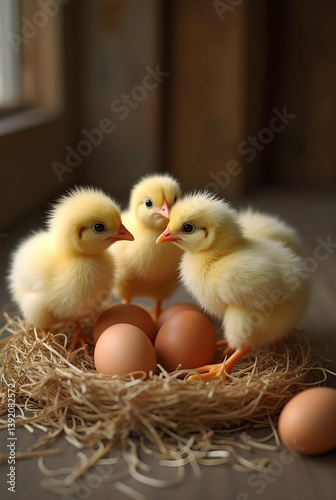 fluffy yellow chicks gather around a nest of brown eggs on a weathered wooden surface