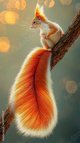 Fluffy-tailed squirrel perched on branch at sunset.