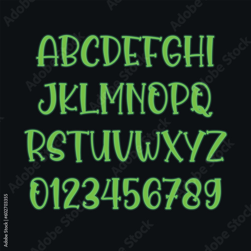 Fluorescent green alphabet capital letters and numbers set. Creative font on black background. Vector illustration.