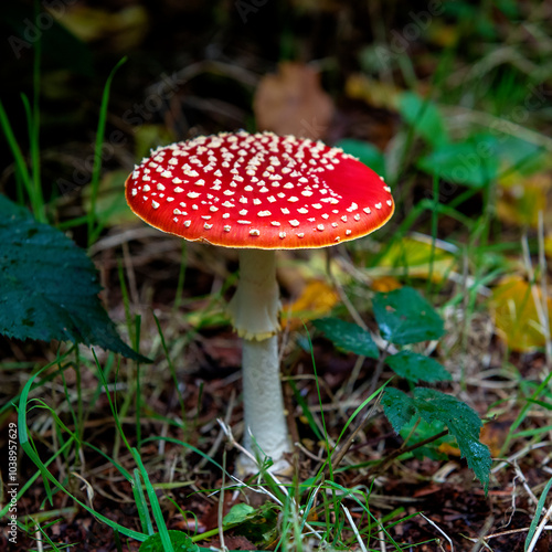Fly agaric or amanita (Amanita muscaria) mushroom in autumn, Koekelare Forest, Bruges Region, Belgium.