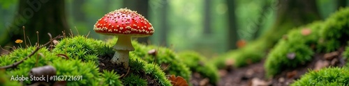 Fly agaric parts spread on mossy forest floor with roots, , woodland